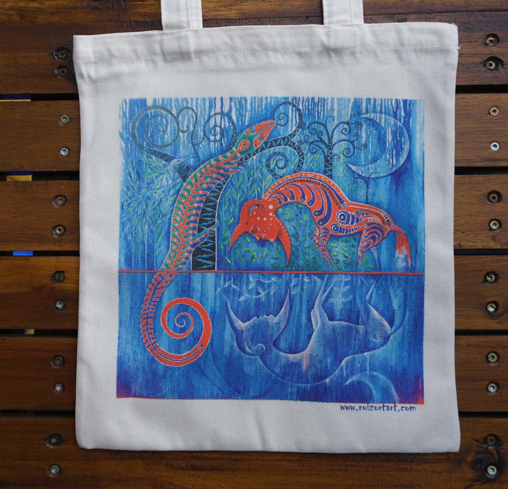 Print of one of the illustrations from our children's book, Caramond, on a fabric bag measuring 37 cm long and 34 cm wide. The ribbon measures 20 cm from the base to the highest point and is sewn to the bag 13 cm apart.